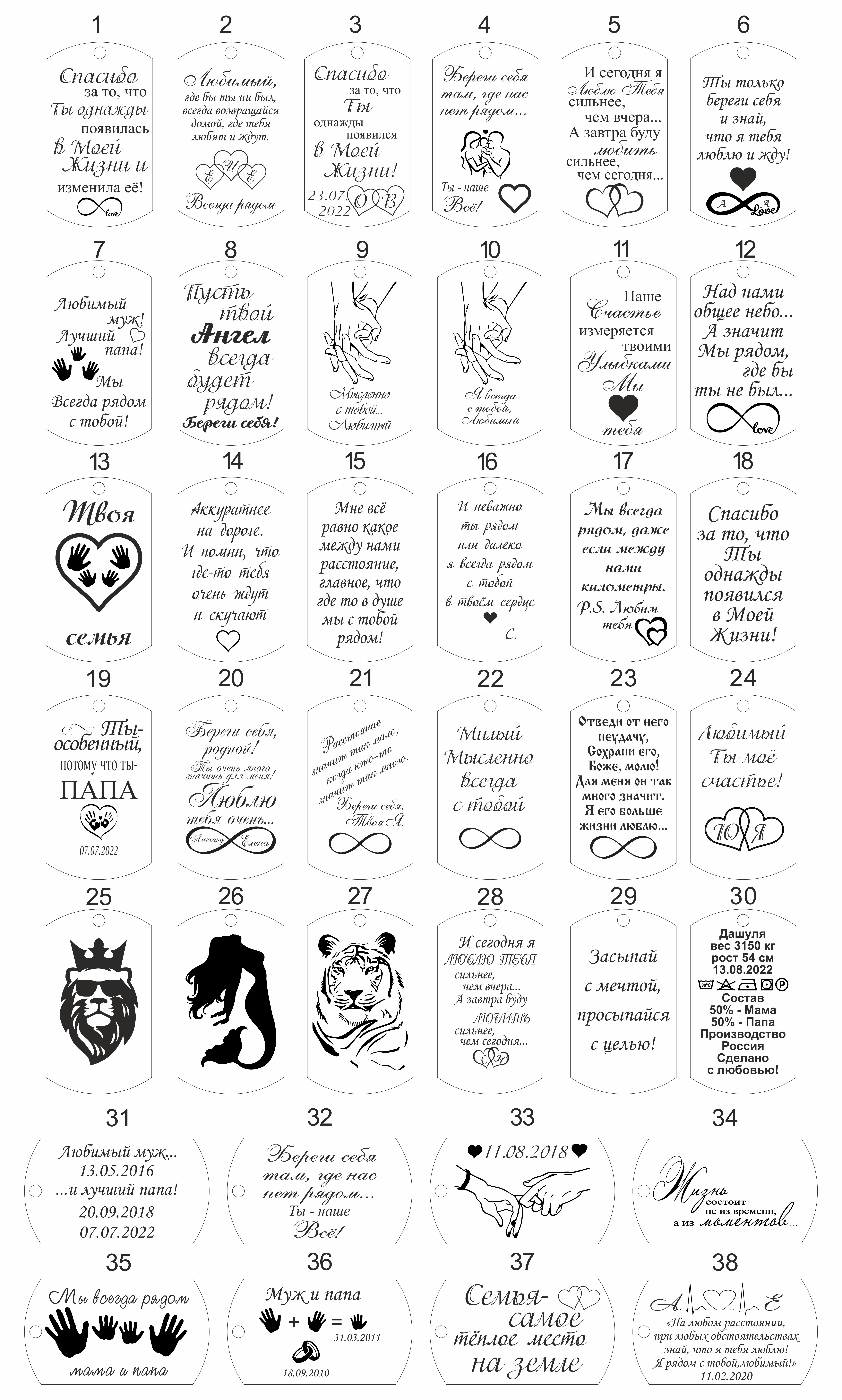 Вы можете выбрать текст гравировки из наших примеров, так же при оформлении вы указываете в комментариях к заказу, что поменять в тексте, добавить или наоборот удалить рисунок и так далее, на какое окончание заменить, а мы сделаем макет и вышлем вам на согласование в любой мессенджер.